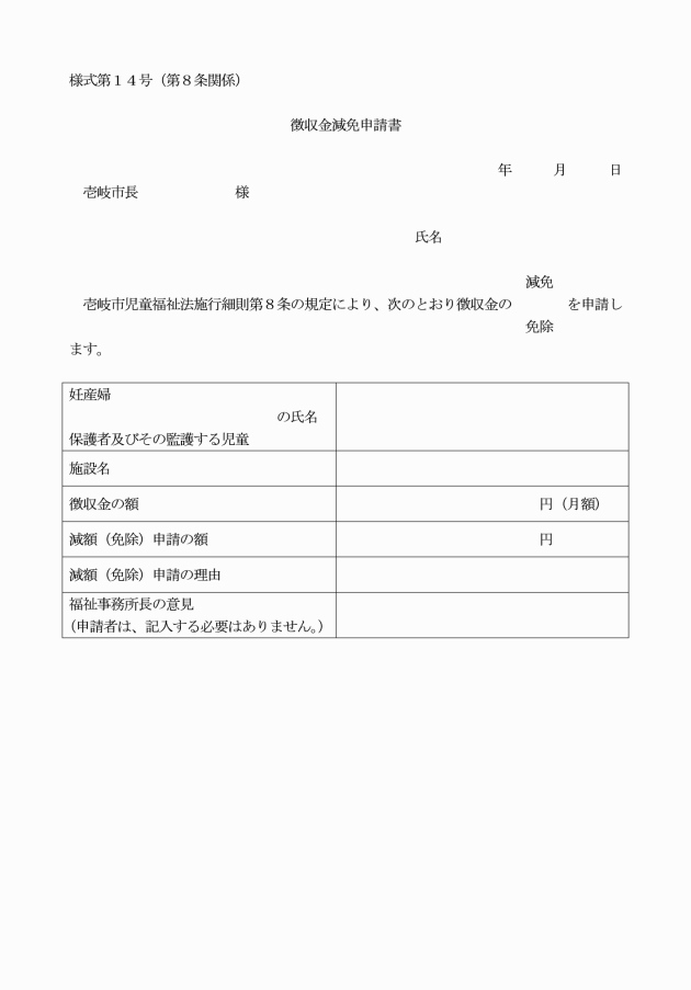 第2条 法第22条第2項の規定により助産の実施を希望する者は、助産施設入所申込書(様式第1号)を壱岐市福祉事務所長(以下「福祉事務所長」という。)に提出しなければならない。