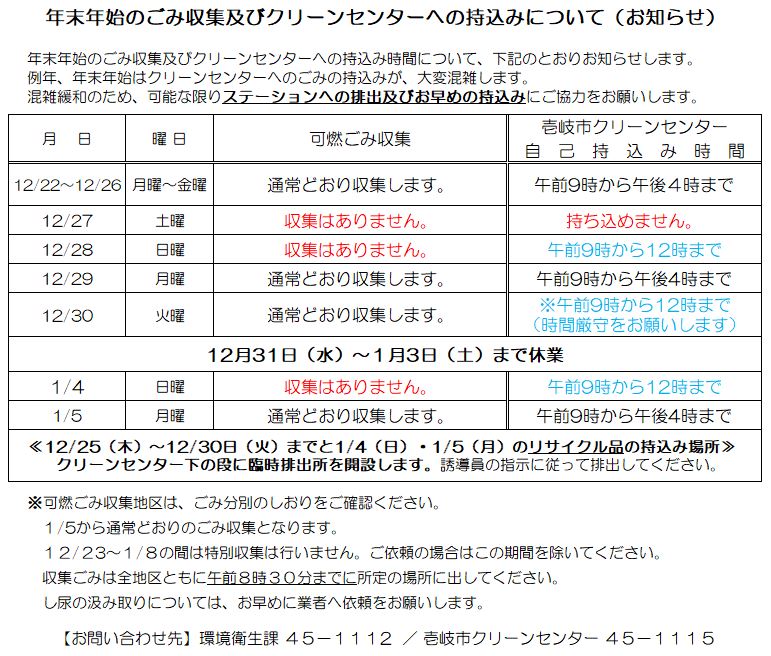 年末年始のごみ収集及びクリーンセンターへの持込みについて(令和7年-令和8年)