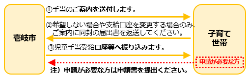 申請不要の児童手当受給者は、原則、児童手当受給口座に振り込みます。