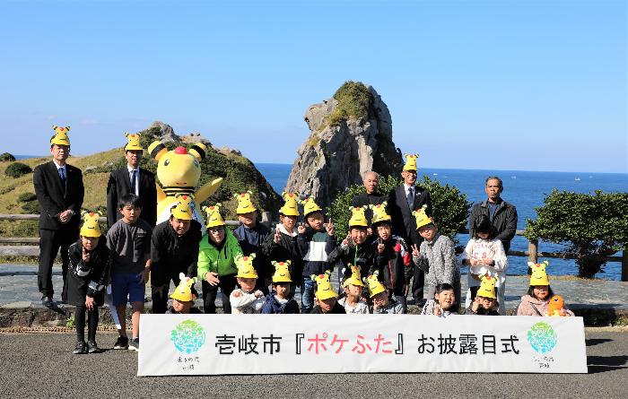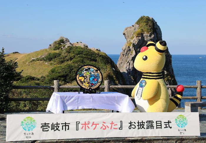 株式会社ポケモン(東京都)から寄贈いただきました『ポケふた』のお披露目式を、11月22日(土曜日)に黒崎園地の猿岩にて行いました。ながさき未来応援ポケモンの『デンリュウ』も駆けつけるなどにぎやかな雰囲気のなか、沼津小学校の皆さんの除幕により、壱岐市の『ポケふた』がお披露目となりました。