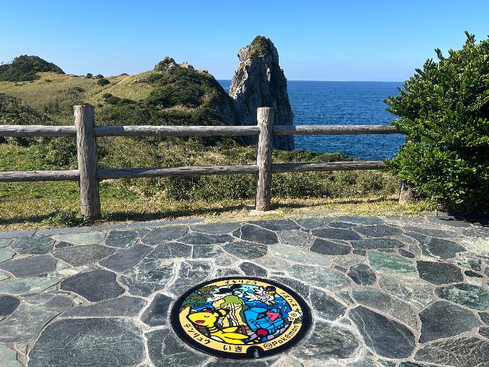 壱岐市の『ポケふた』には、市章のモチーフとなった水仙とまきの木のような絵柄と、ながさき未来応援ポケモンの「デンリュウ」、壱岐市と名前が似ている、インコポケモンの「イキリンコ」ホワイトフェザーのすがた、赤い鼻が必ず北を向くと言われているコンパスポケモンの「ノズパス」が描かれています。さらに、奥にもう1匹、シルエットで描かれているポケモンがおり、訪れる方々に楽しんでいただけるものとなっています。
