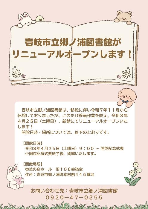 壱岐市立郷ノ浦図書館は、移転に伴い令和7年11月4日(火曜日)より休館しておりましたが、このたび移転作業を終え、令和8年4月25日(土曜日)、新館にて、リニューアルオープンいたします。