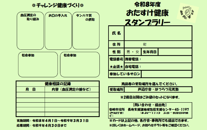 壱岐市では、市民皆様が自ら意欲的に楽しみながら介護予防に取り組み、自己の健康管理に役立てていくことを”おたすけ”するために、「おたすけ健康スタンプラリー」を実施しています。